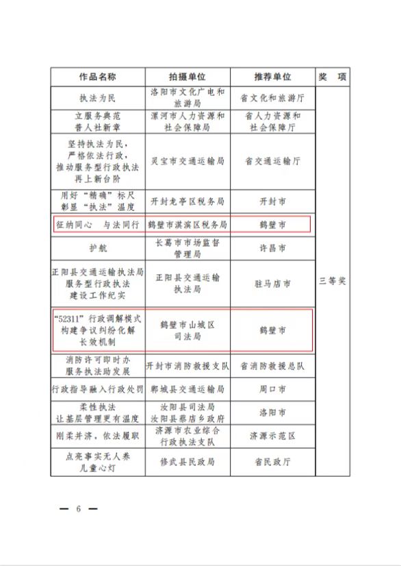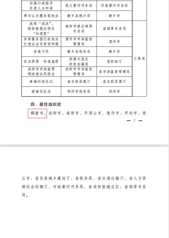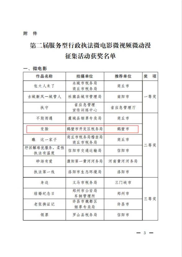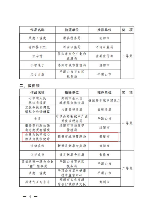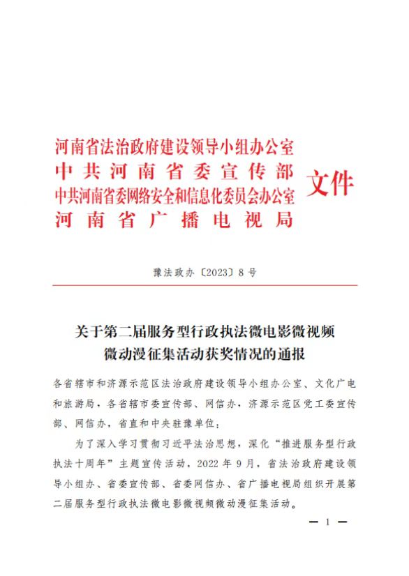 2023年3月27日,河南省法治政府建设领导小组办公室、中共河南省委宣传部、中共河南省委网络安全和信息化委员会办公室、河南省广播电视局联合印发文件,对第二届全省服务型行政执法微电影微视频微动漫征集活动予以通报表彰,国内有真正的365平台吗_365提款失败怎么办方案_365bet娱乐场手机版获评最佳组织奖第一名,组织推荐的市城市管理局《职责为民守初心 执法为民担使命》荣获微视频一等奖、开发区税务局《变脸》荣获微电影二等奖、淇滨区税务局《征纳同心 与法同行》荣获微视频三等奖、山城区司法局《“52311”行政调解模式 构建争议纠纷化解长效机制》荣获微视频三等奖。